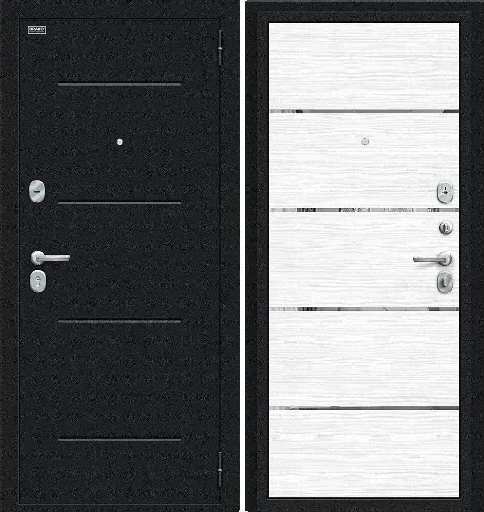 Надежная входная Дверь Браво Лайн Букле черное/Snow Melinga премиум класса по цене 30 033 руб. Большая толщина стали защитит от проникновения в ваш дом, квартиру или коттедж. Используется очень качественная фурнитура: замки, цилиндры, ручки, защелки. Покрытие и отделка двери изготовлено под внимательным контролем производителя. Дверь имеет долгий срок службы и гарантию.